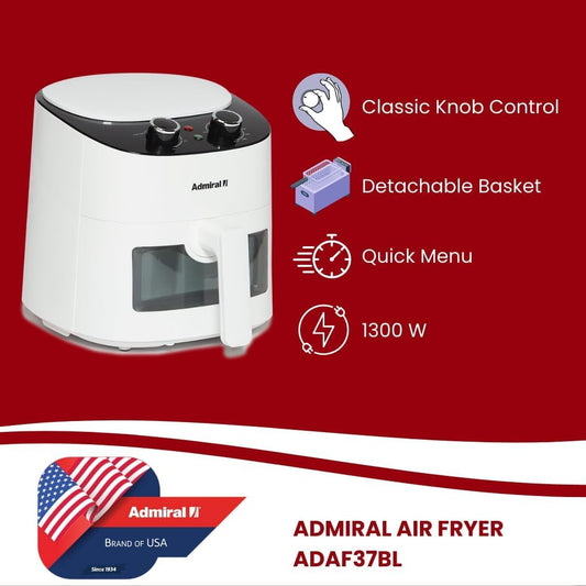 Admiral Air Fryer 3.7L, 1300W, Classic Knob Control, Transparent Window, Detachable Basket, Cool Touch Handle, Dishwasher Safe, ADAF37BL, 1 Year Warranty.