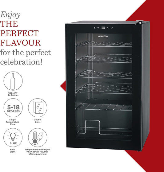 Kenwood Beverage Cooler 24 Bottles Wine Cooler Refrigerator With Double Glass Door, Blue Light, Smart Temperature Control Bcm24.000Bk Black