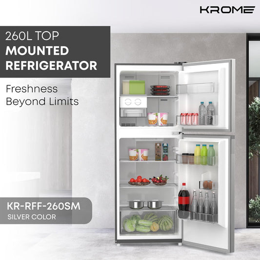 KROME 260L Gross,Double Door Top Mounted Refrigerator with Multi Air Flow System,No-Frost Cooling with Electronic Touch Temperature Control,Door Alarm, Silver, 10 Year Compressor Warranty-KR RFF 260SM