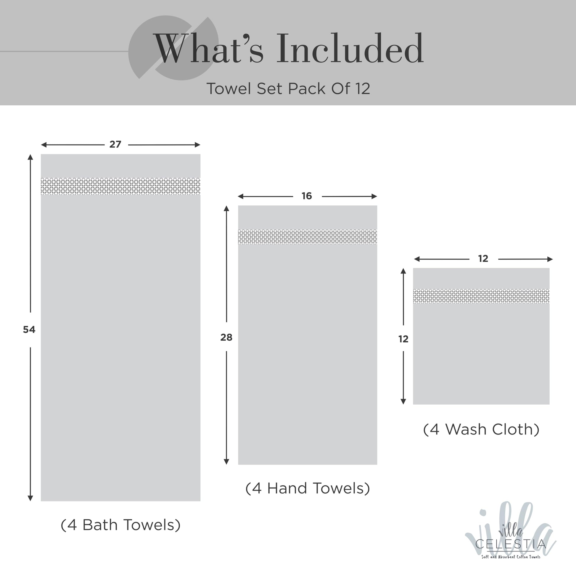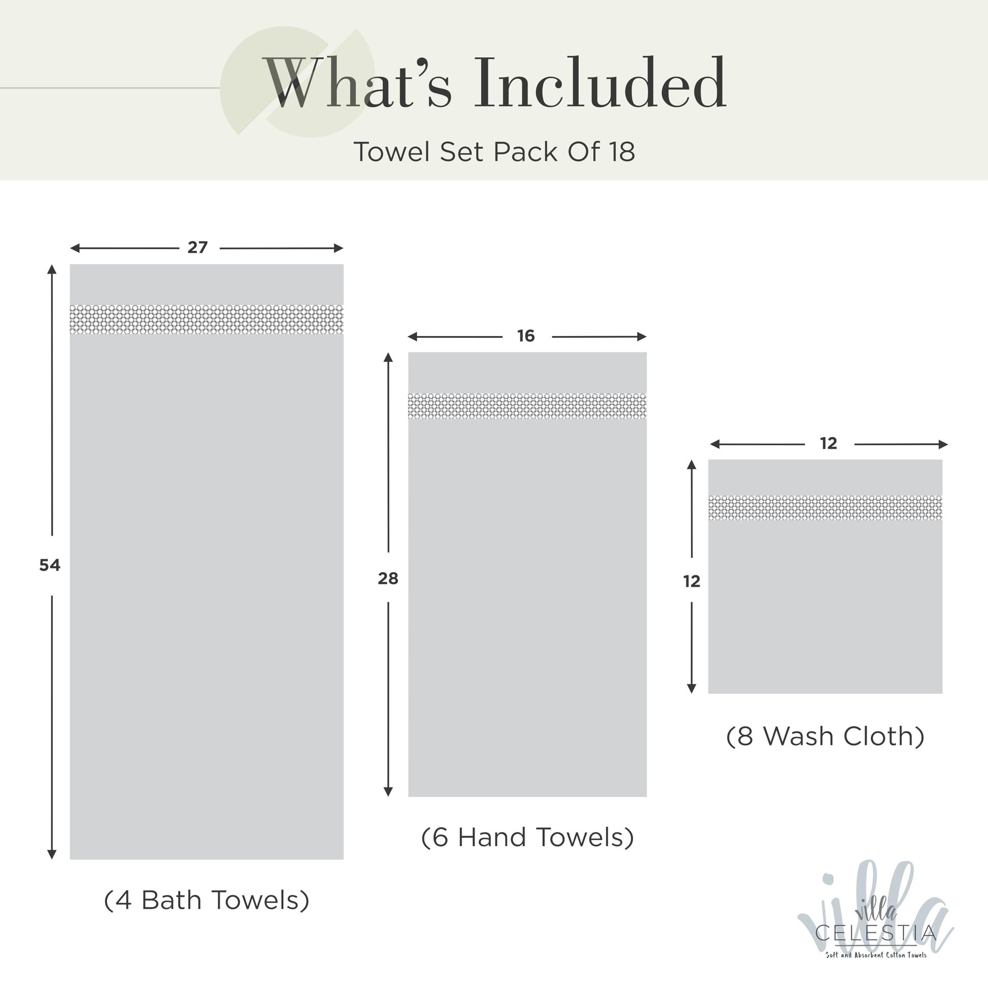 • VILLA CELESTIA LUXURIOUS TOWEL SET (PACK OF 18): Uplift your mood and bathing experience with the super soft and luxurious touch of our Villa Celestia Bath Towels Set. Bundled in a 18 pack design, our towel sets for bathroom consists of 4 Bath Towels (27” X 54”), 6 Hand Towels (16” X 28”), and 8 Washcloths (12” X 12”), giving you the complete package of comfort, indulgence, and delight.