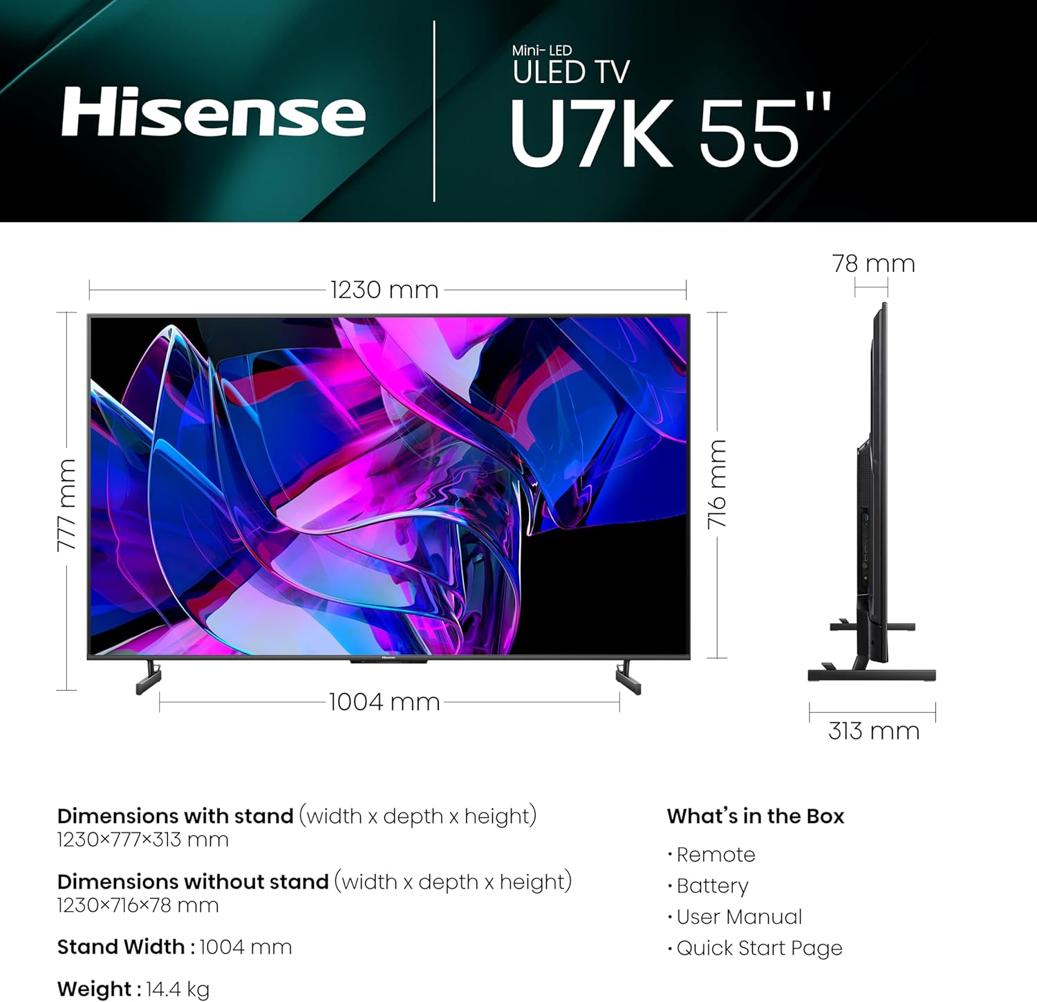 Hisense 55-Inch U7 Series Mini-LED ULED 4K UHD Smart TV (55U7K, 2024 Model) - QLED, Native 144Hz, 1000-Nit, Dolby Vision IQ, Full Array Local Dimming, Game Mode Pro, Alexa Compatibility