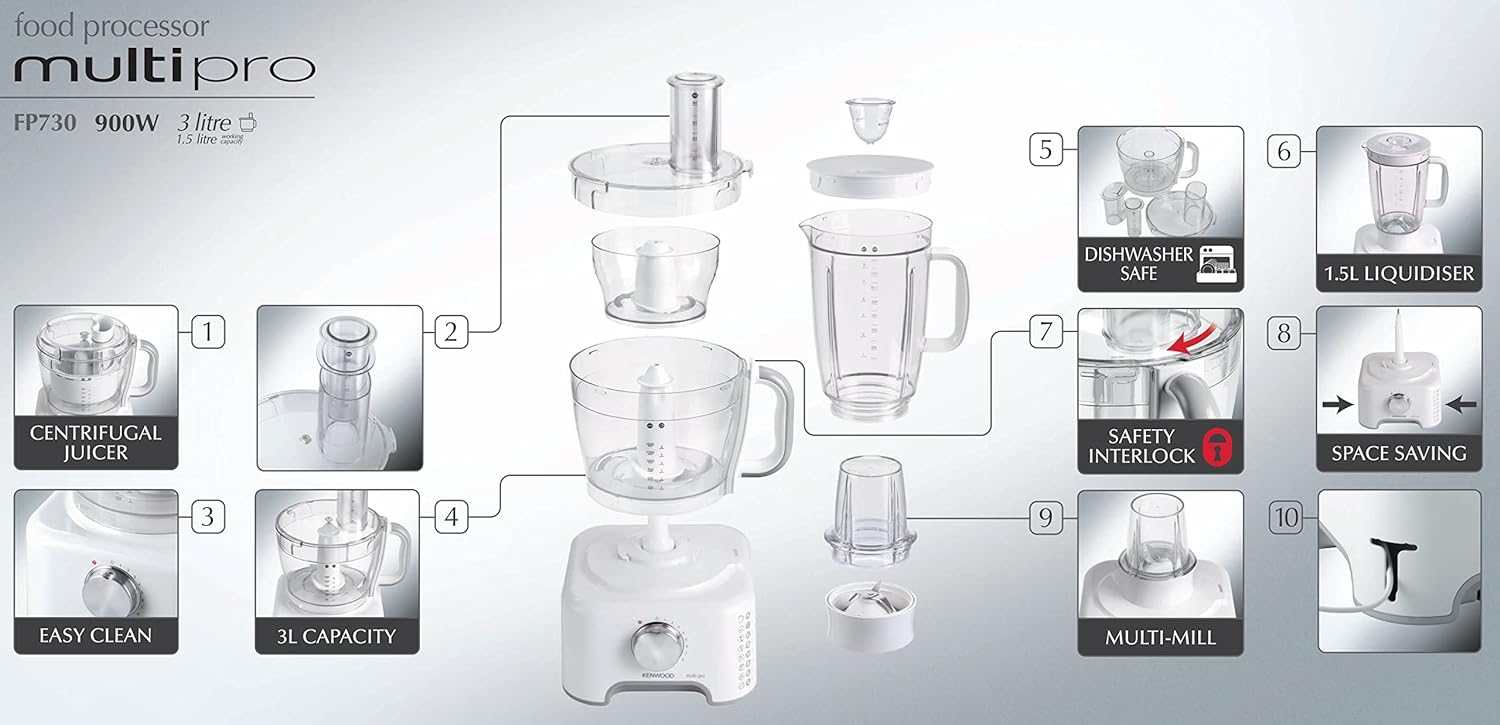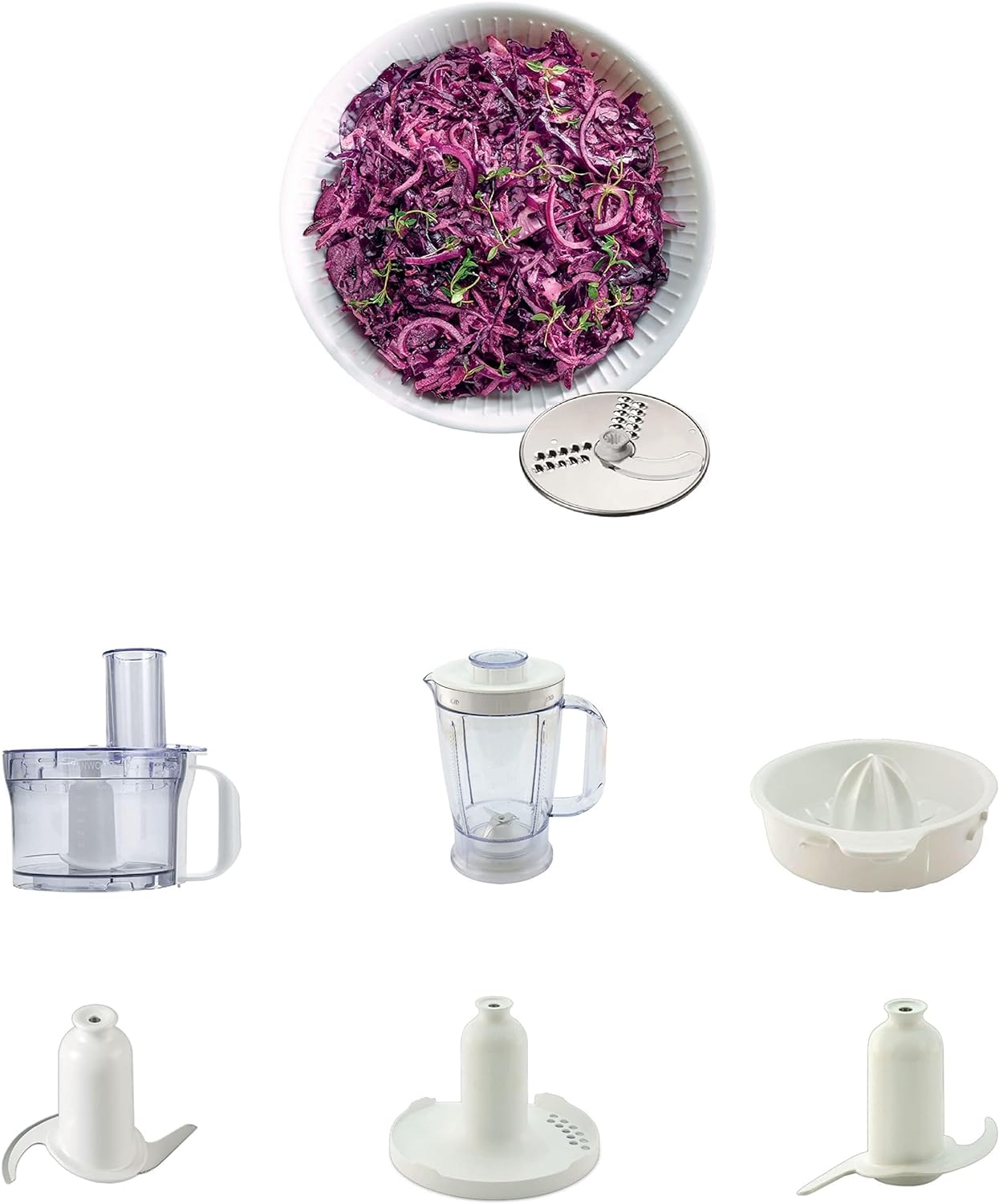 - Interchangeable chopper blades for chopping and pureeing, plastick blade for kneading bread and pastry mixes