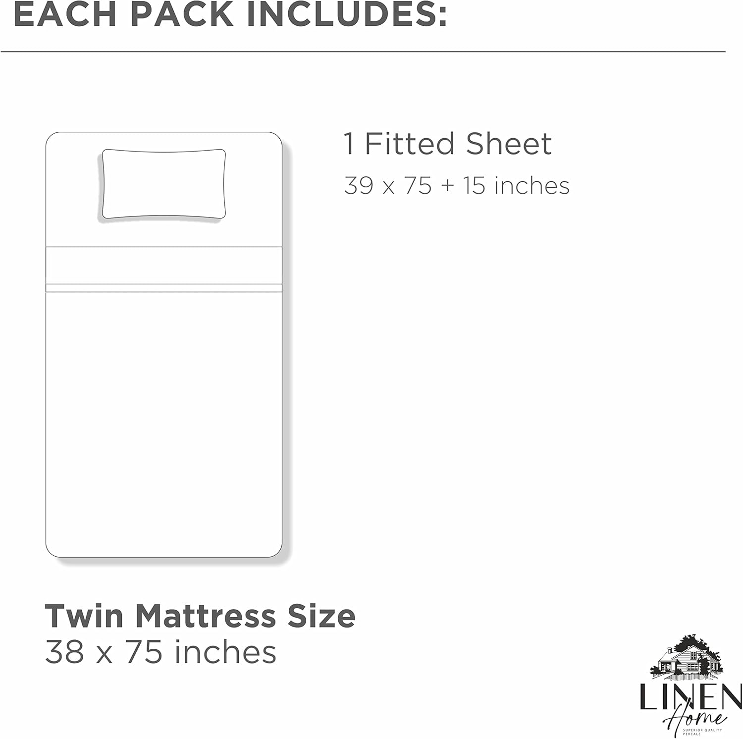 Linen Home 100% Cotton Percale Weave Fitted Sheet, Twin Size, White, 1 Deep Pocket Fitted Sheet, Fits Mattress Upto 16" Crisp and Cool Strong Bed Linen, 39"X75"+15"