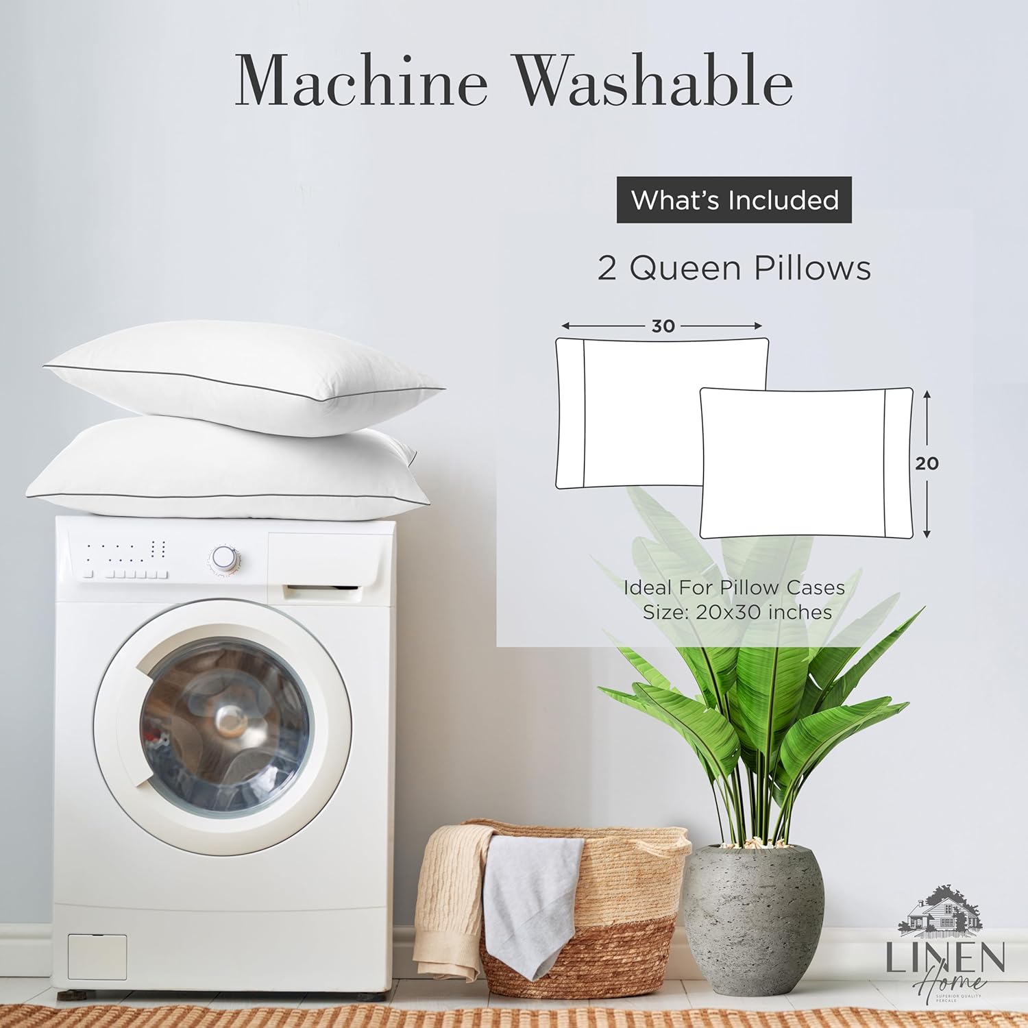 Linen Home Down Alternative Pillows with Grey Piping, Queen Size Pillows Set of 2, Bed Pillows for Side and Back Sleepers, Cooling Pillows for Sleeping, Ideal for Pillowcases Size - 19 X 26 inches