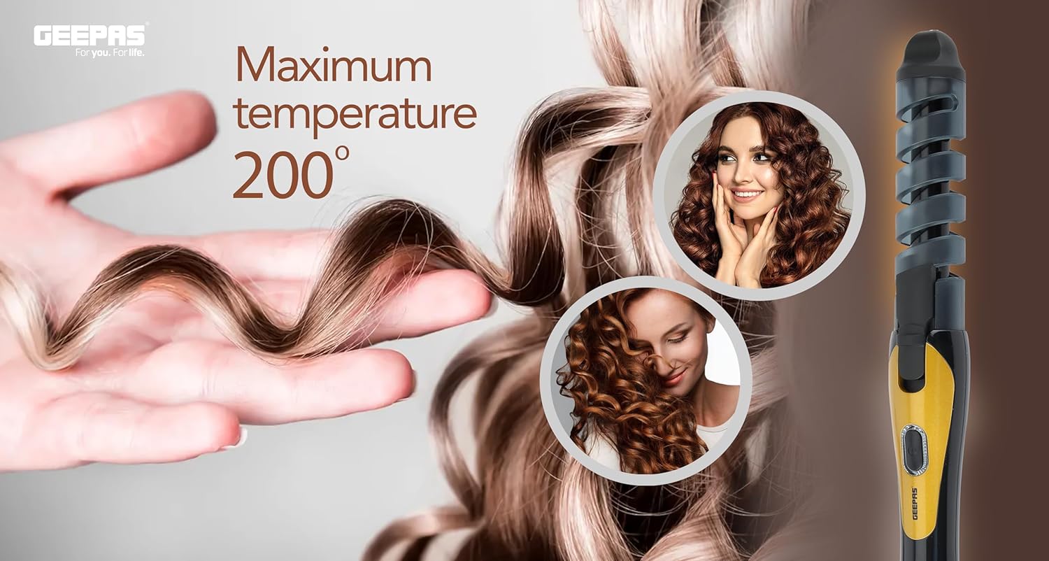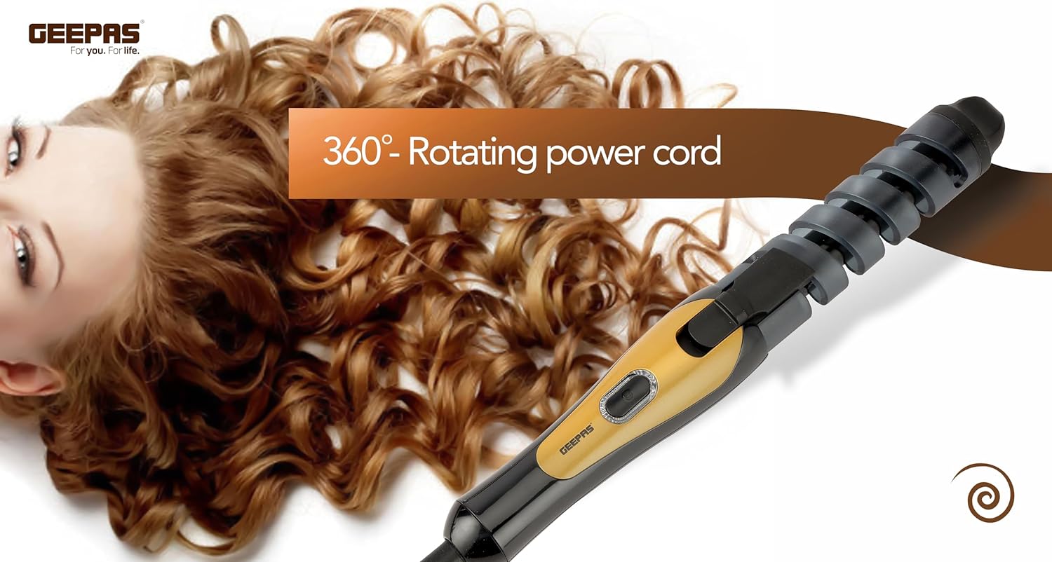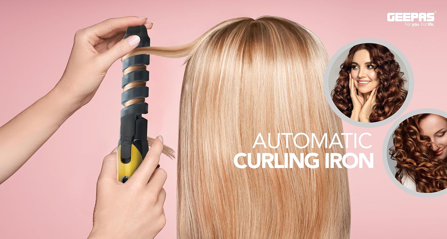 Durable motor, fast and quiet professional brush motor for precise modelling with 360 degree rotating power cord, easy to curl hairs in different styles and doesn't make much sound like other products. Automatic curling technology automatically pull the hair into the ceramic curling chamber, gently fix it in all directions, timing and heating to create smaller, tighter curls or larger waves. 3. Easy to use and portable say goodbye to tradition curling iron or curling wand. No skill required. Learned how to use within 1 minute. Everyone can be a hair curling expert mini size for easy carrying, easy fits in your handbag, gym bag or cosmetic bag, and curls or waves anytime, anywhere. 4. 360 degree rotating power cord 360 degree swivel power cord, you can rotate it at any angle without worry about winding. We meet the international standard line core, which is more convenient for hand operation. 5. With hair clip fixed hair tail clamp the hair tail to the hair clip, and let the hair rotate along the spiral groove to the root position, or you can hold the hair and wrap the hair directly around the curling iron barrel. Your hair won't spread or messy during curling with the hair clip. 6. Secure hold clip the secure hold clip guarantees the beautiful curl, gently but securely locking your hair into place. Avoid unprofessional and messy results with spiral curling iron secure hold clip 7. Good quality curling iron geepas curling irons pretty much have the same purpose as regular curling irons and that is to curl hair, it curls hair quickly heat and keeps your hair smooth and bright and protect your hair without dry and frizz.