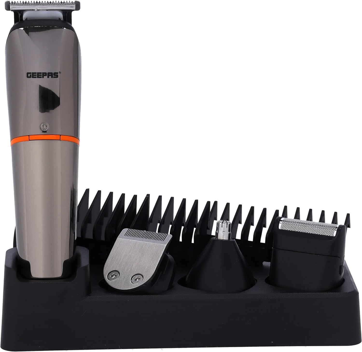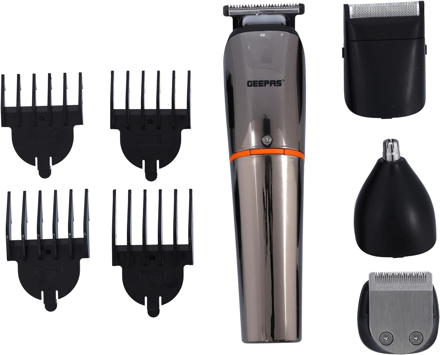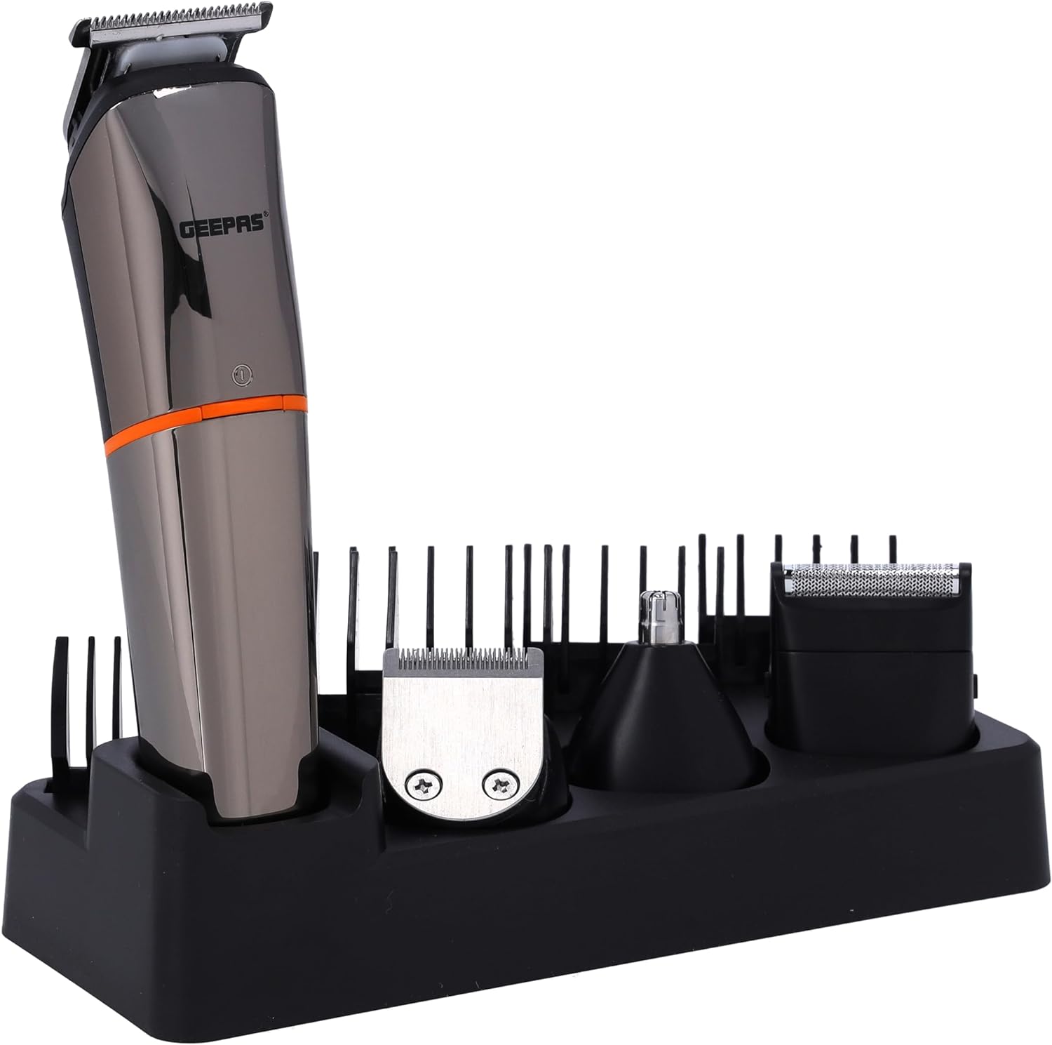 Hey, I Can Make you Look Smart! Geepas 9-in-1 Rechargeable Multi Grooming Kit Geepas 9-in-1 Multi Grooming Kit provides you with a simple and effortless solution to your daily trimming, cutting and styling needs. It is specifically designed to catch every hair and give excellent trimming results. Ideal for complete grooming, for beards, stubble, necklines, ears, nose and sideburns the geepas rechargeable trimmer gives you the freedom of 90 minutes cordless trimming, with soft-touch elements and an ergonomic shape so you can easily trim and detail. The sharp blades ensure a precise and effective trim, while rounded tips and combs are gentle on your skin preventing irritation. The integrated hair lifts combs (3,6,9, & 12mm) lifts and guides the hairs to the level of the blades for effortless, even trimming. Its body is covered with rubber, to give comfortable grip. Cleaning is a breeze, simply rinse clean under running water and store away. It's fast and easy to refine and customize your look. This kit includes: full-size trimmer; micro shaver; body hair trimmer with adjustable length comb; nose and ear hair trimmer; 4-length adjustable comb; and a travel pouch. The rechargeable battery delivers the power of Lithium, with up to 90 minutes of runtime in a single charge. The stainless steel trimming blades are designed for maximum comfort and precision, while the range of attachments gives you the power to remove unwanted hair anywhere. Plus, all the removable attachments are easy to rinse clean under the faucet.