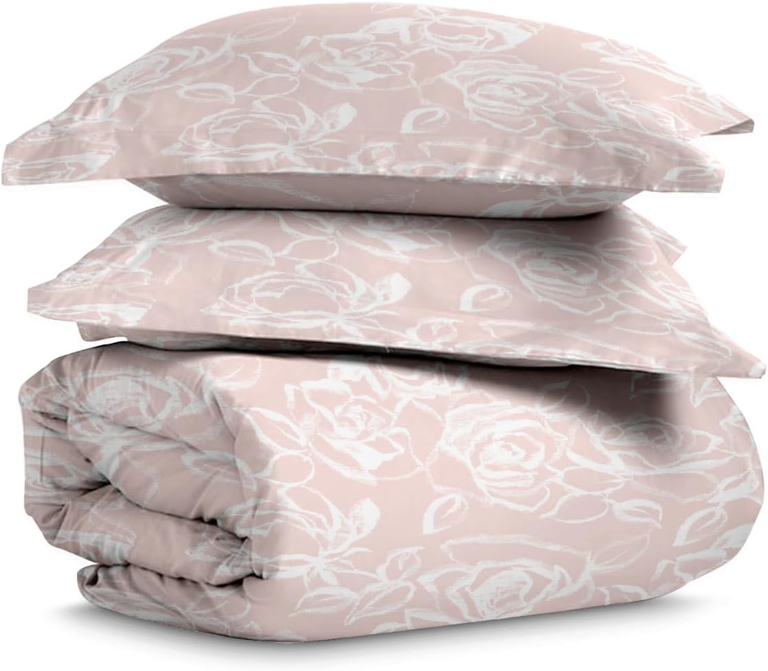 Pizuna Cotton Pink Simply Floral Duvet Cover Full Size, 400 Thread Count Long Staple Cotton Quilt Cover Full, Sateen Full Duvet Covers with Button Closure (100% Cotton Full Size Bedding Set)