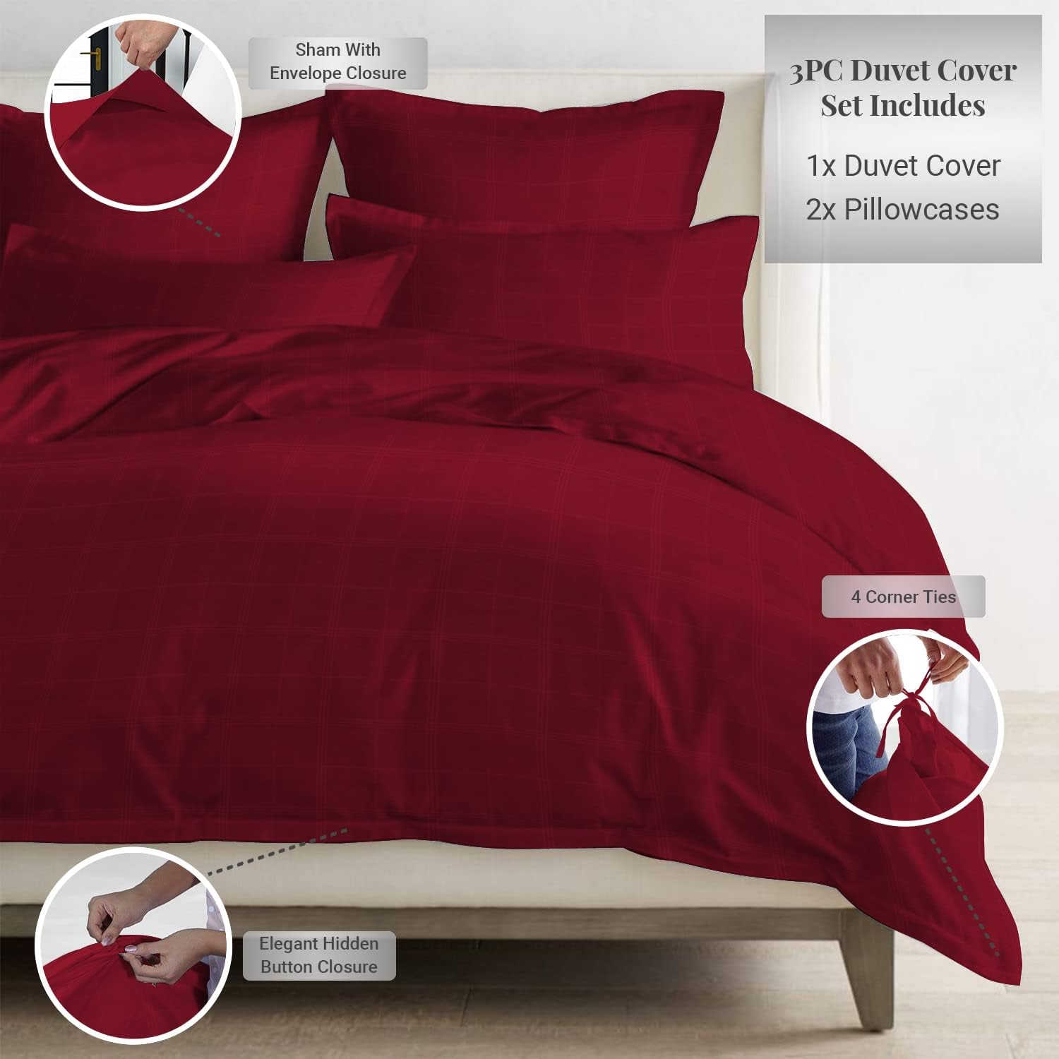 Pizuna Cotton Full Duvet Cover Set, 300 Thread Count Long Staple Cotton Sateen Weave with Button Closure (Combed Checks Luxury Red Cotton Duvet Cover Full)