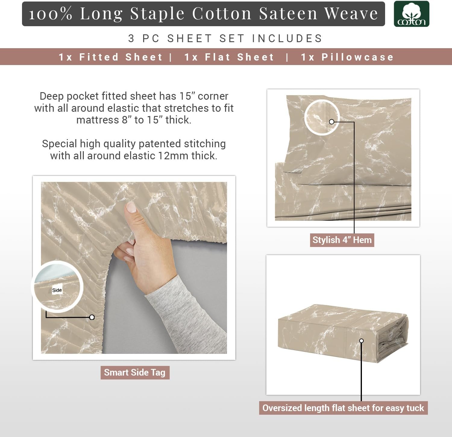 Pizuna Marble Taupe Print Twin Cotton Sheets Set, 400 Thread Count 100% Long Staple Twin Cooling Sheets Cotton Sateen Weave, 15 Inch Deep Pocket Twin Sheets Set (Printed Cotton Sheets)