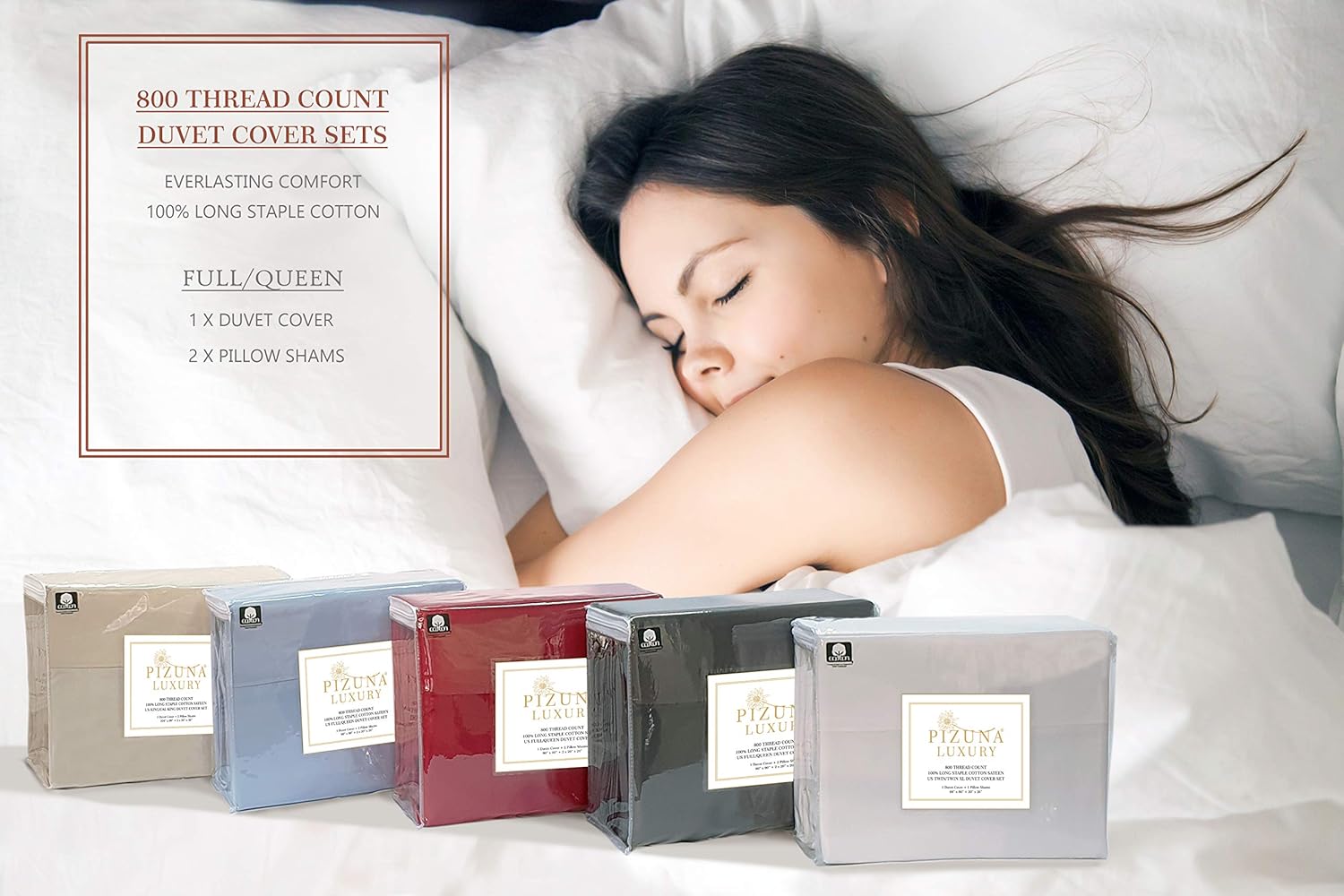 - 100% Natural & Authentic Mercerised Combed Cotton: With Pizuna's fine yarn technique, this authentic 800 Thread Count combed cotton queen duvet cover set features a single dent (4 up-1 down) sateen weave. Usage of mercerised combed cotton makes this duvet cover set smooth & sturdy. Pure & natural cotton bedding wrinkles but it is distinctively cooler & breathable. Further, it softens and the wrinkling reduces with every wash.