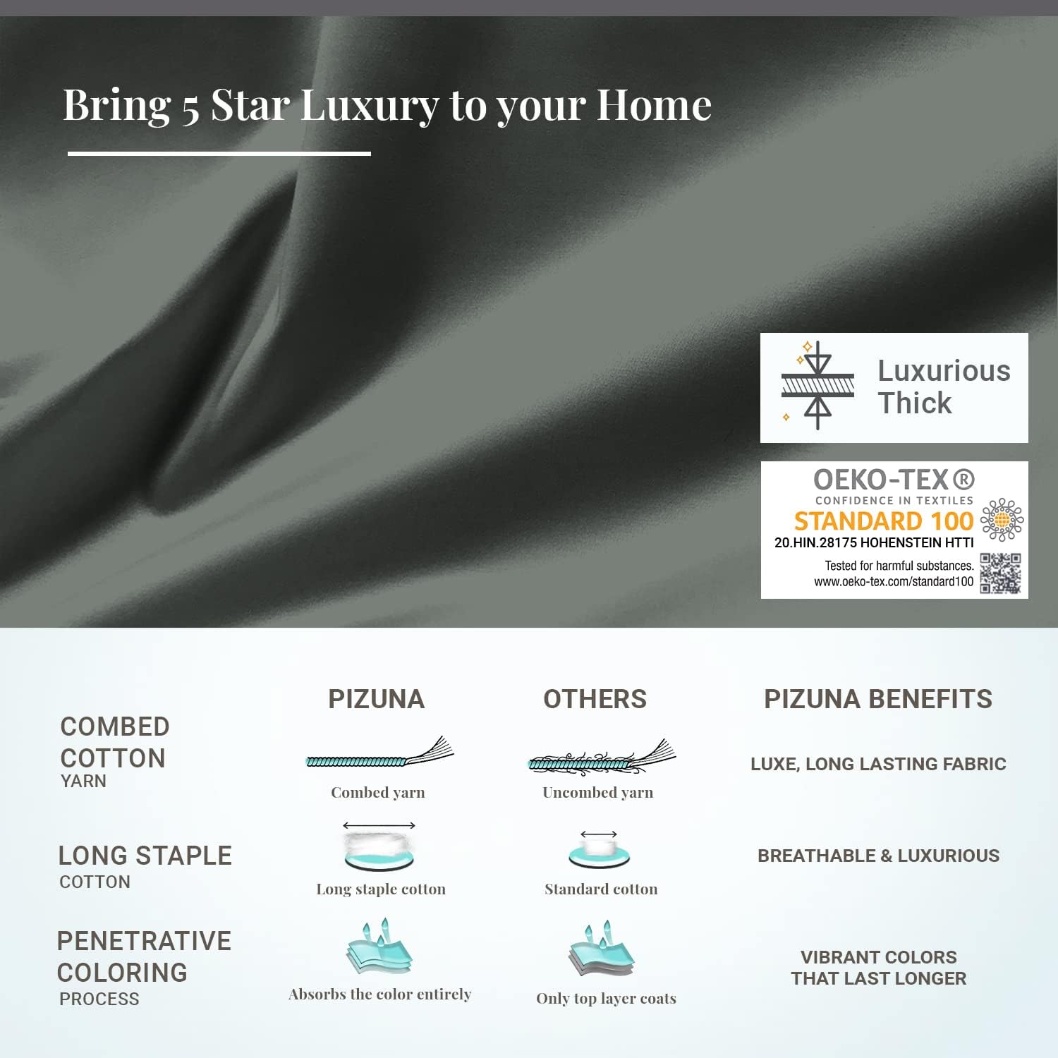 - Pizuna Quality Standard: Pizuna products are individually tailored, measured and checked (piece by piece) by our Quality Assurance team. The fabric in queen duvet cover cotton is OEKO-TEX & AZO-Free Certified (2024), free from synthetic substances and planet-friendly, making it soothing even for the most delicate skin